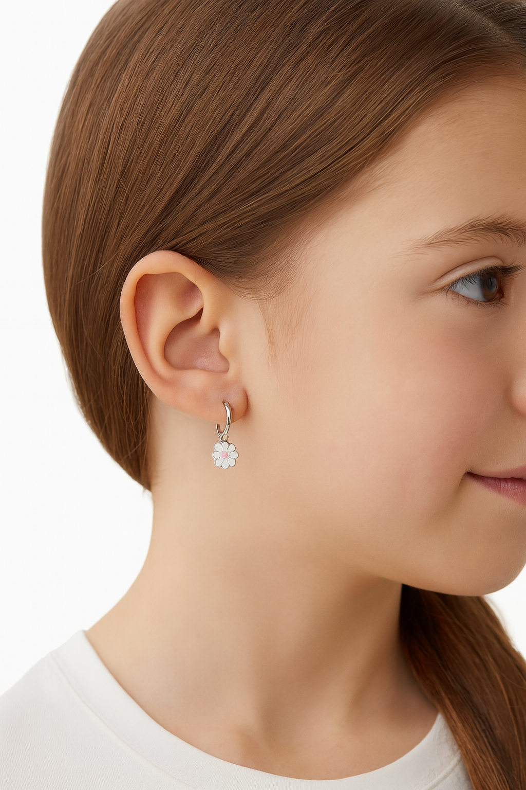 Внесете нотка елегантност и нежност с нашите красиви детски сребърни обеци халки с висяща висулка "Бяло Цвете". Листенцата са покрити с бял емайл, а центърът на цветето е акцентиран с бляскав розов кристал (или брокат в емайла), който добавя фин, привличащ погледа блясък. Този нежен дизайн е идеален за по-официални поводи или за елегантен ежедневен стил.