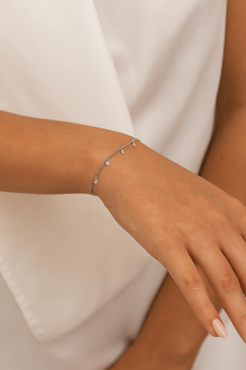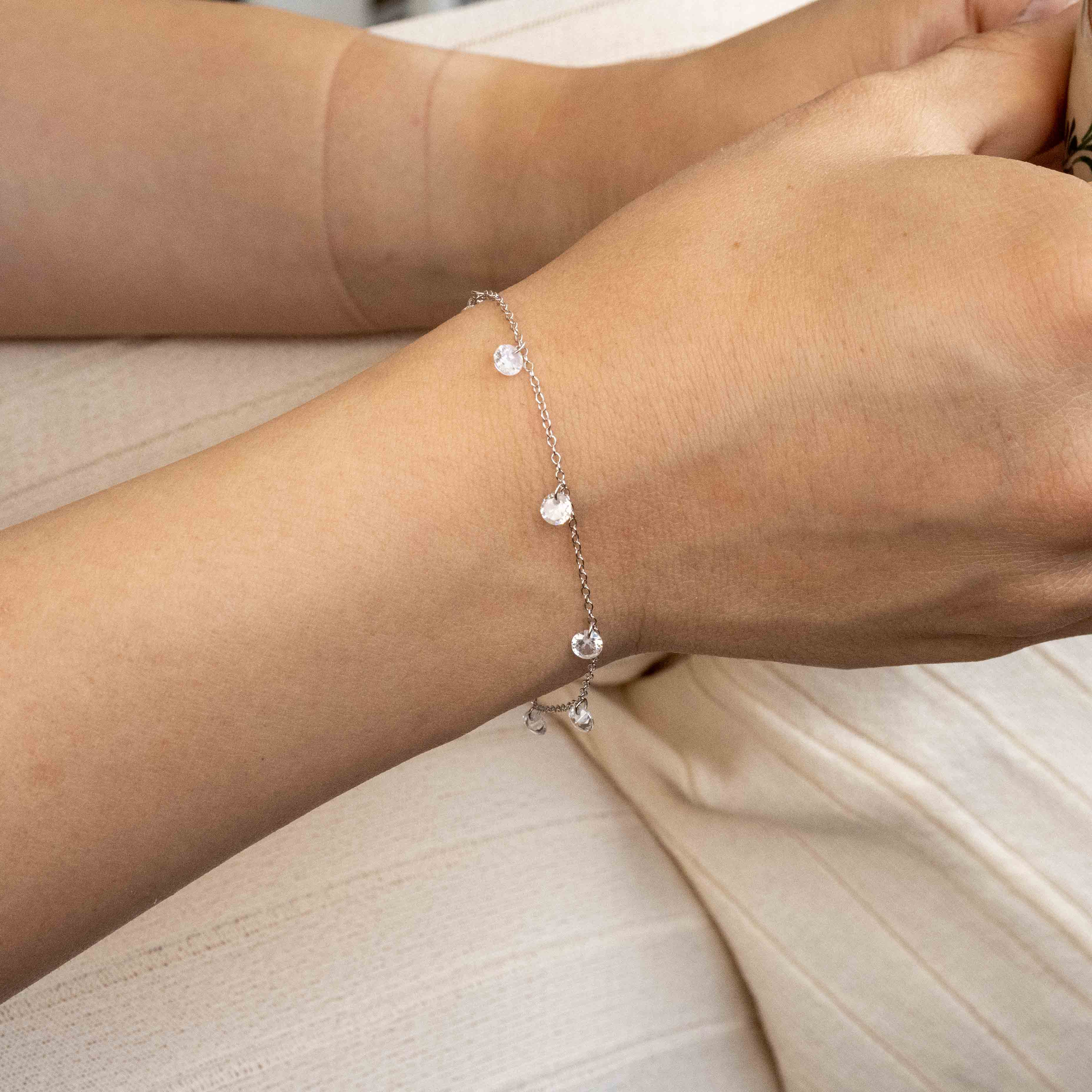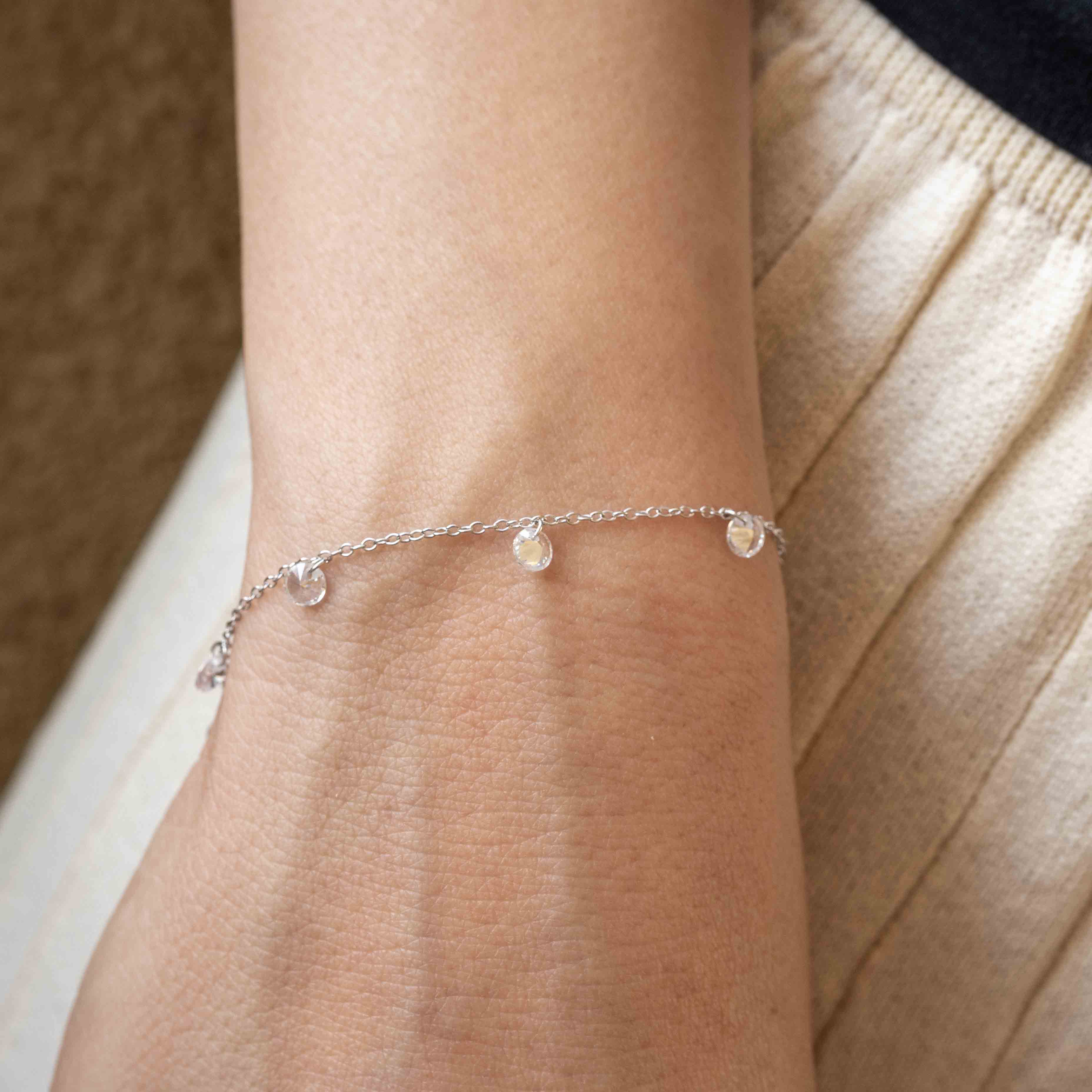 Сребърна гривна Crystal Whisper S925 с малки кристалчета, нежно поклащащи се при движение.