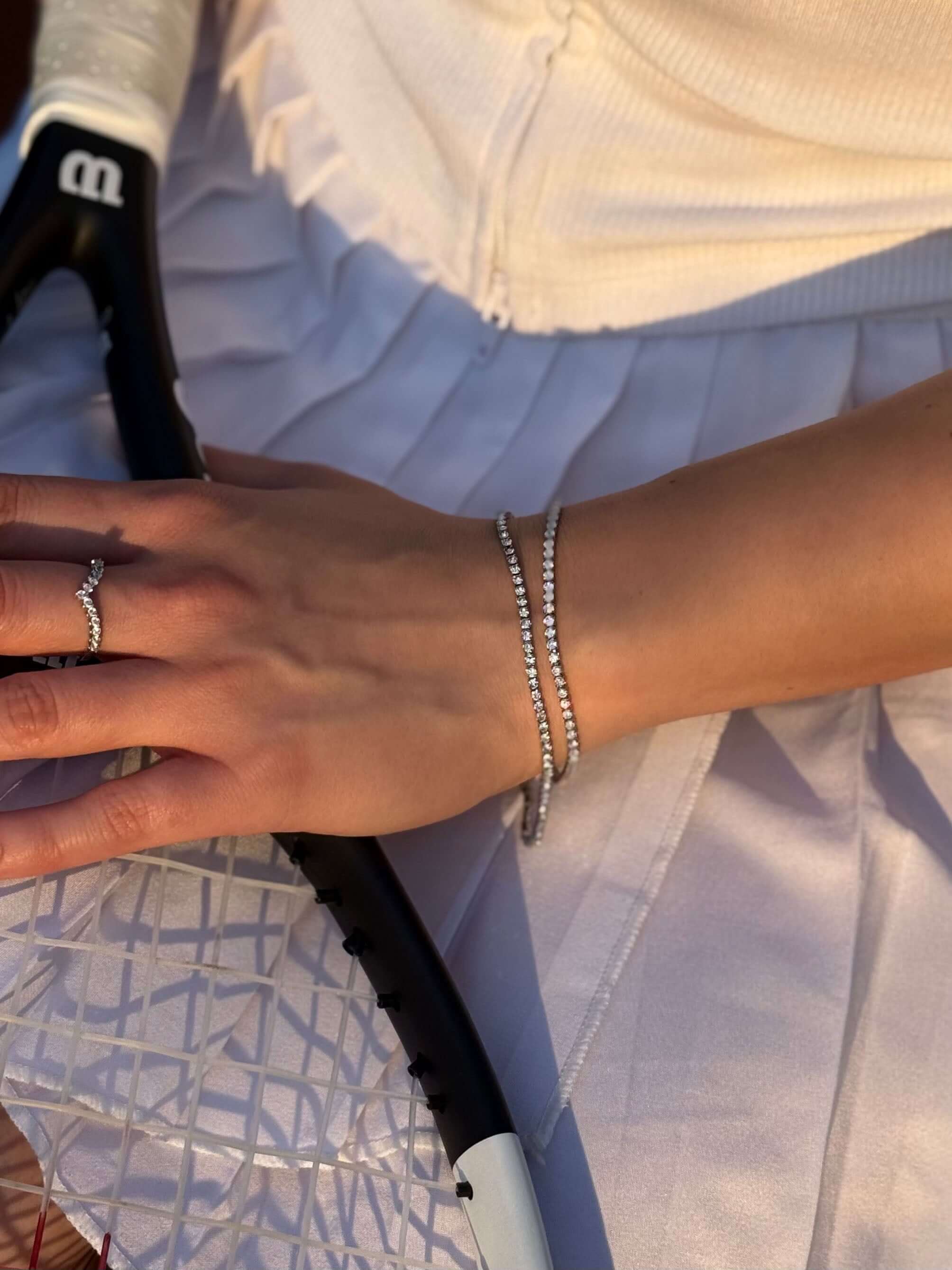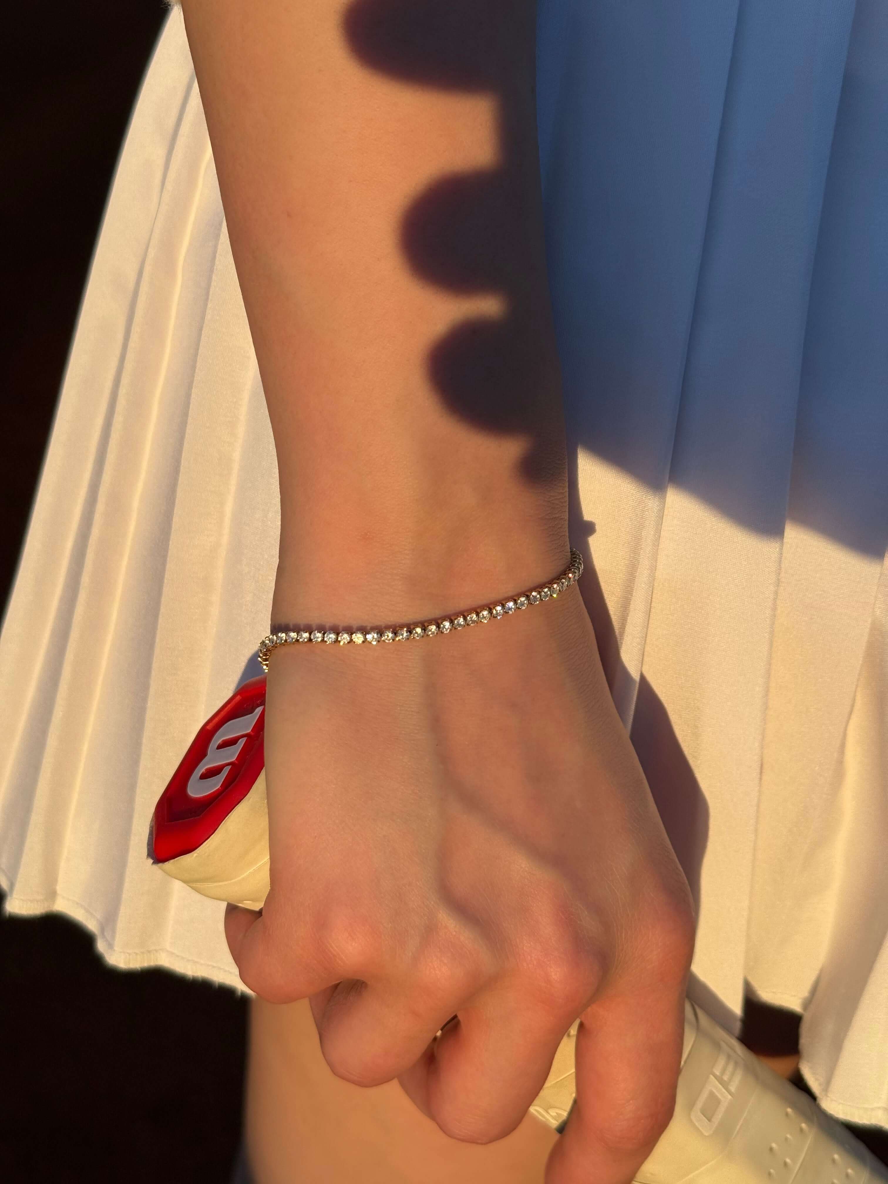 Тенис гривна с 18К златно покритие, носена на ръка, с тенис ракета на фона.