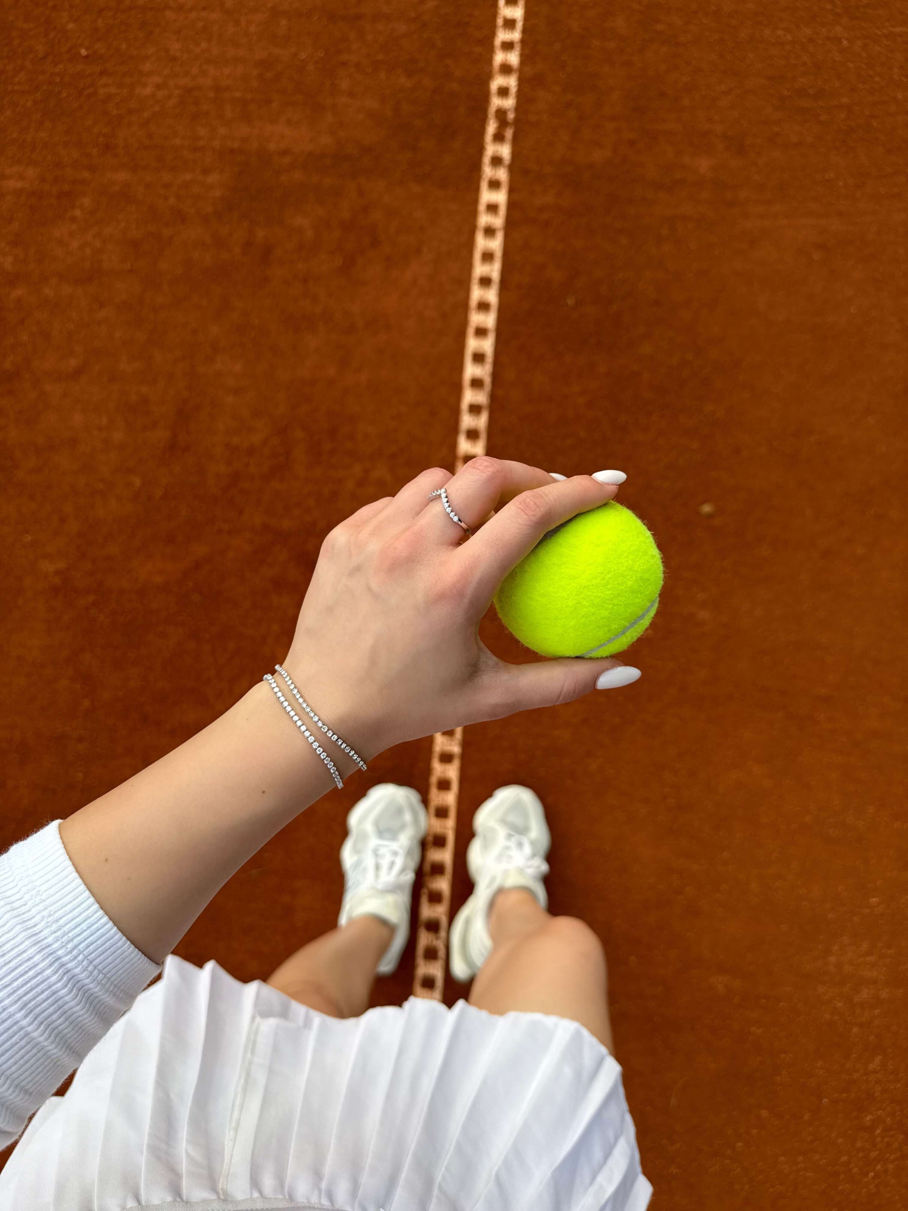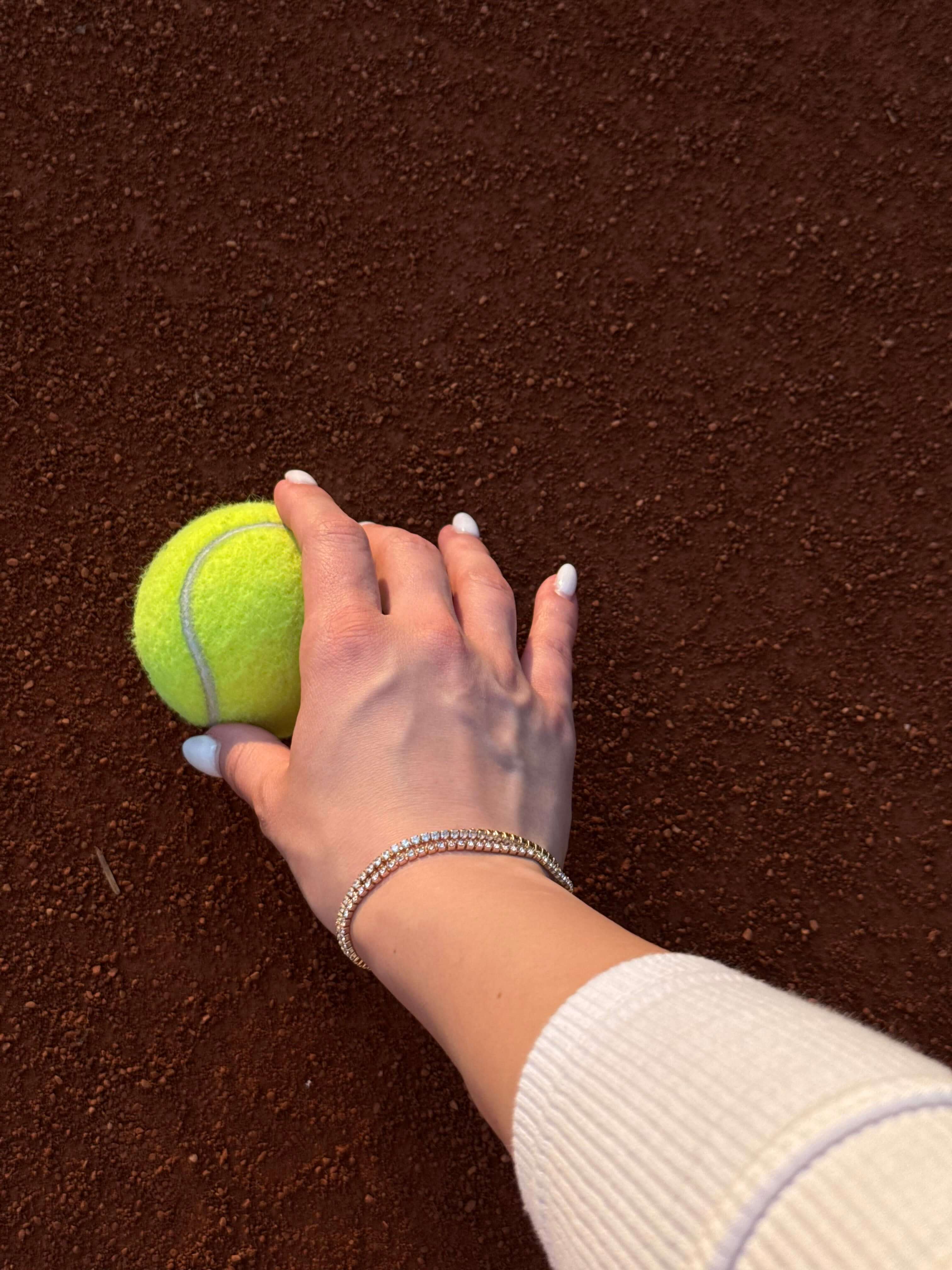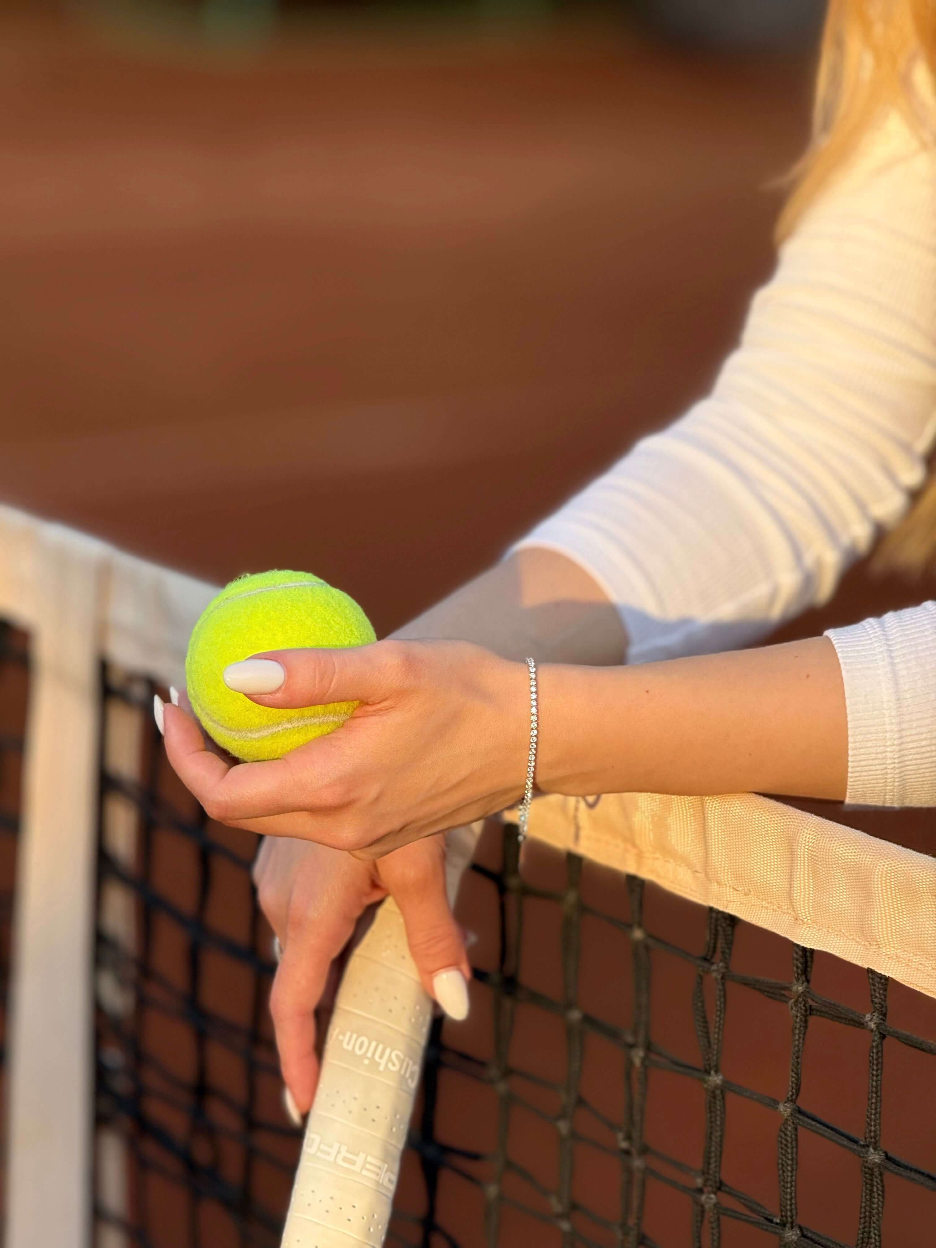 Ръка, държаща тенис топка на червена настилка, с елегантна тенис гривна.