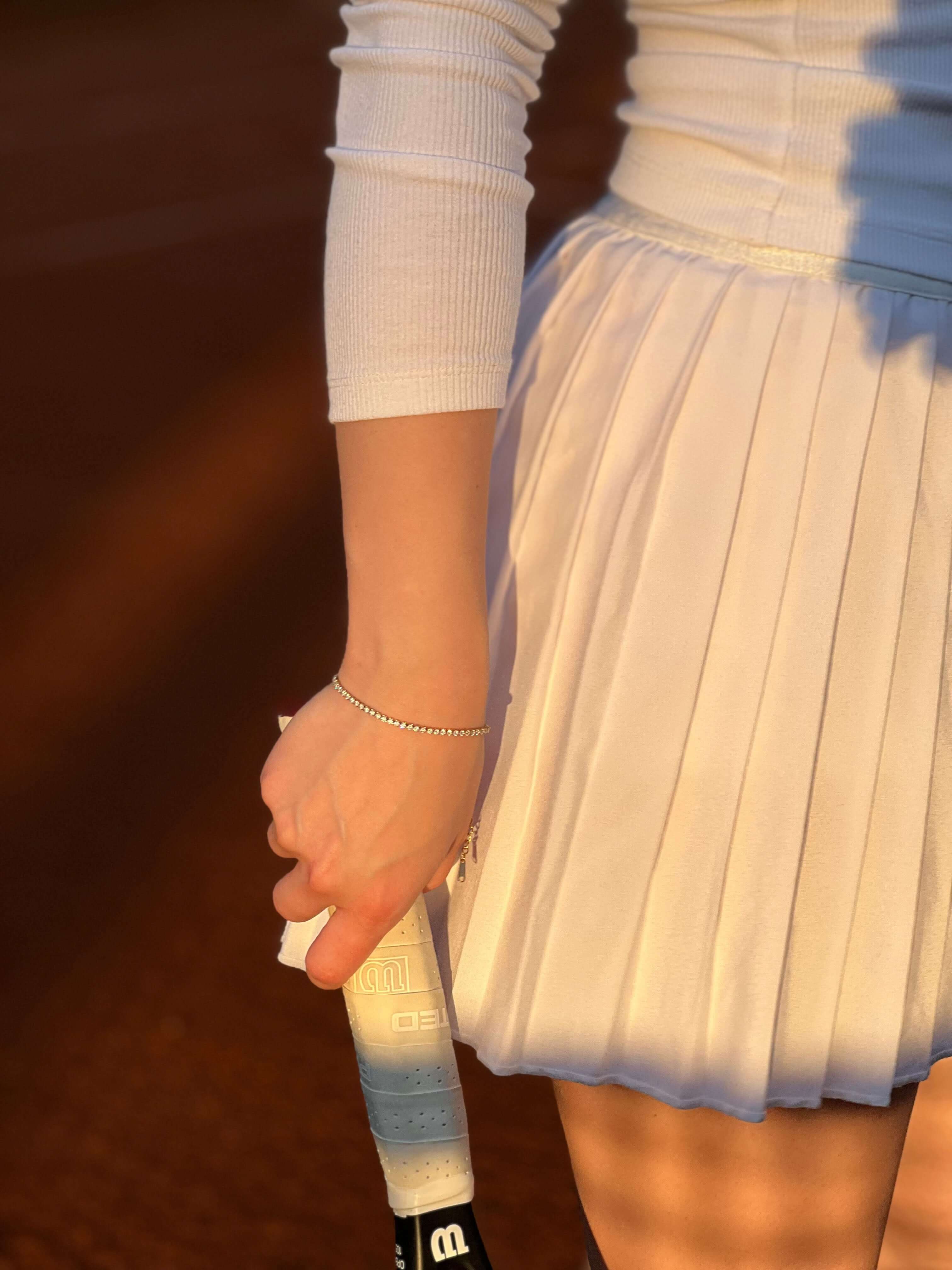 Ръка с тенис ракета, носеща елегантна бяла пола и тънка гривна на тенис корта.
