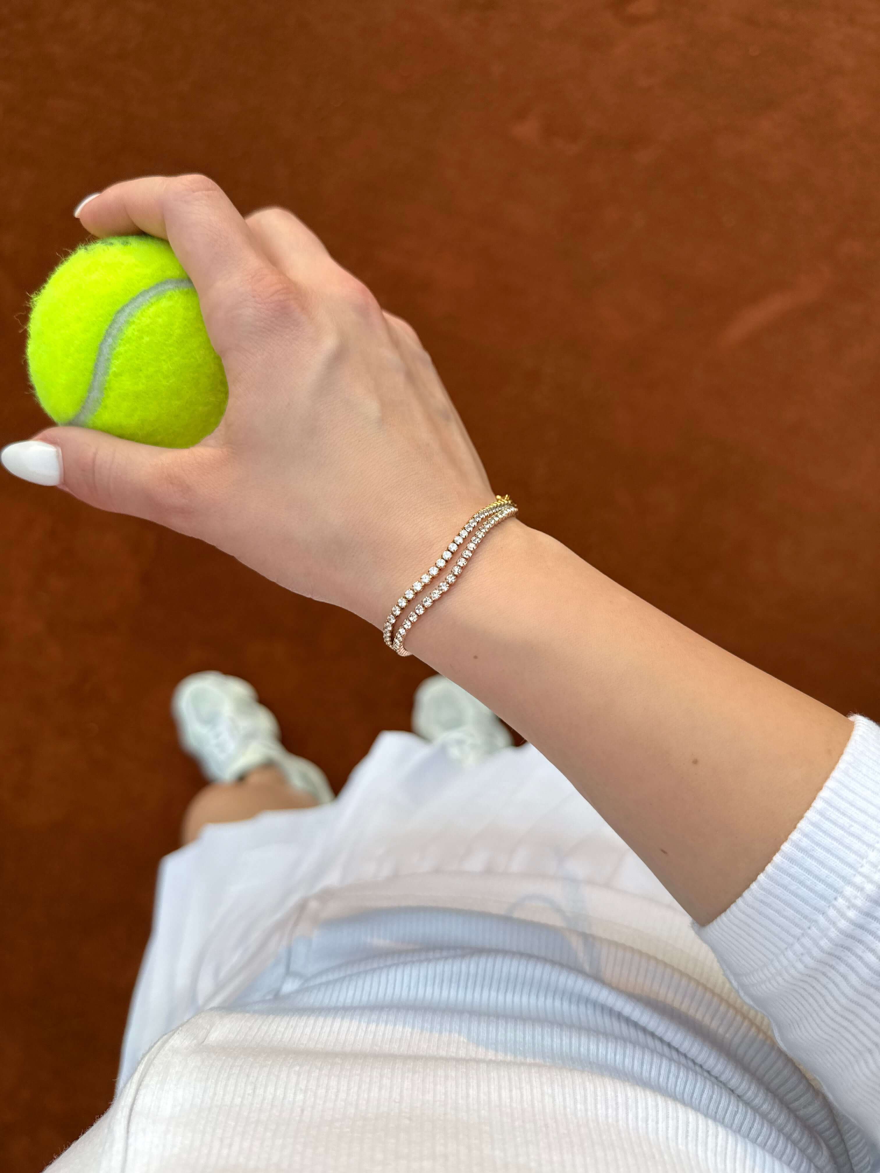 Длан, държаща тенис топка, с тенис гривна от неръждаема стомана и 18К златно покритие.