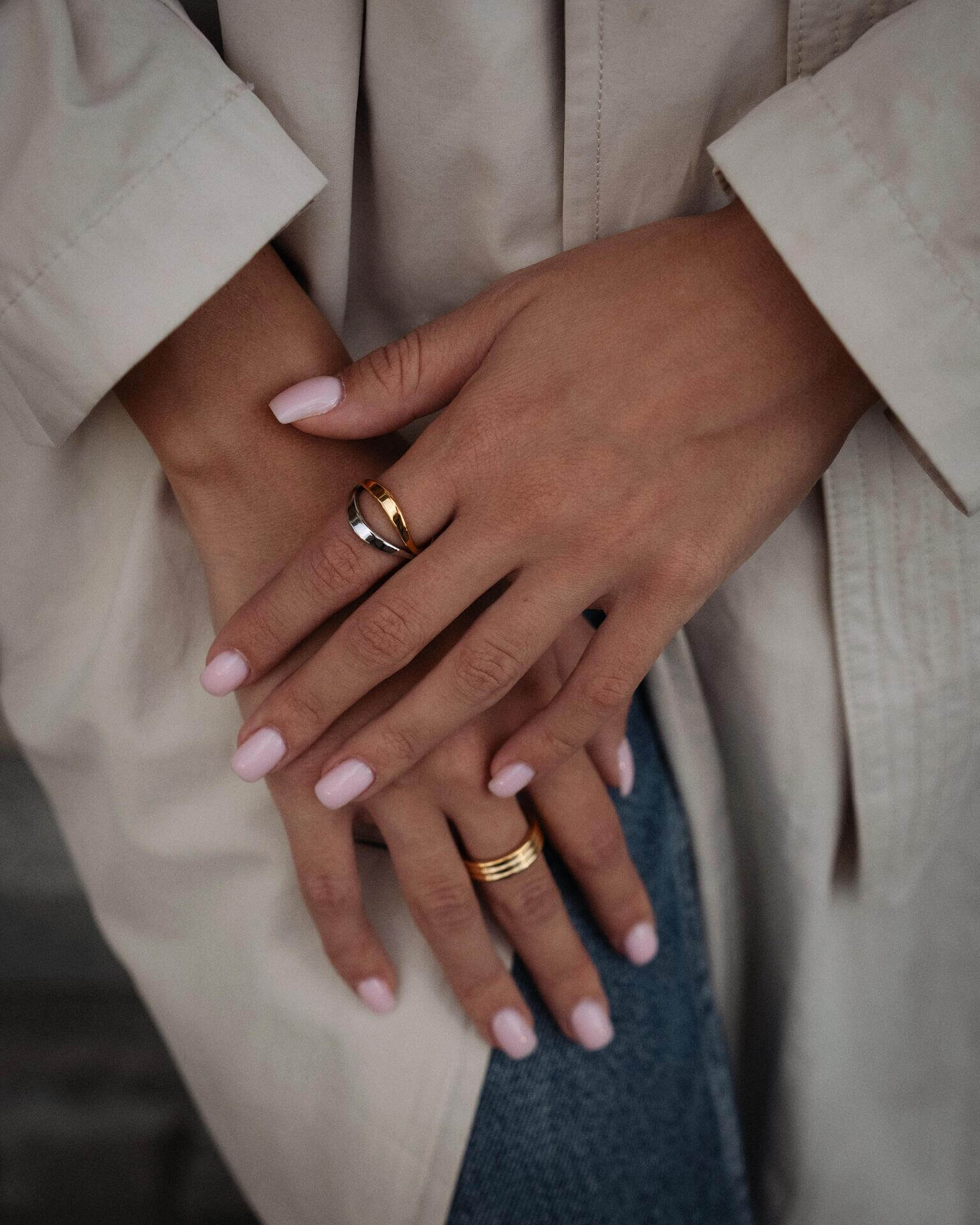 Ръце с пръстени, включително хибриден пръстен с 18К златно покритие, носени с модерен стил.