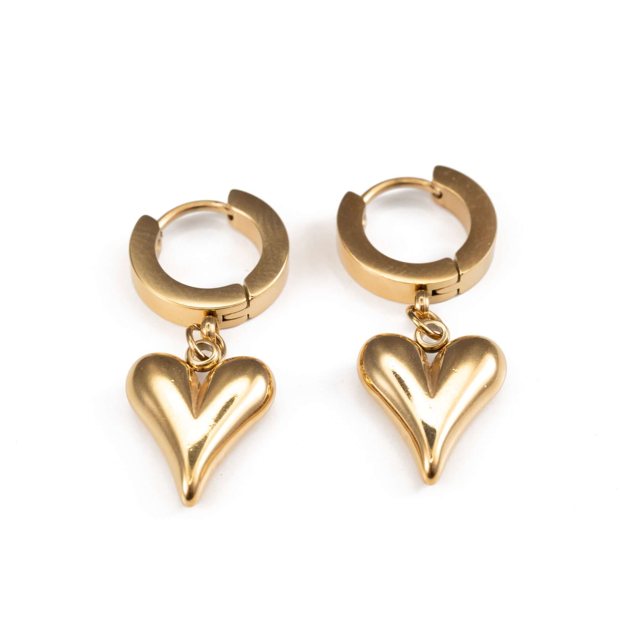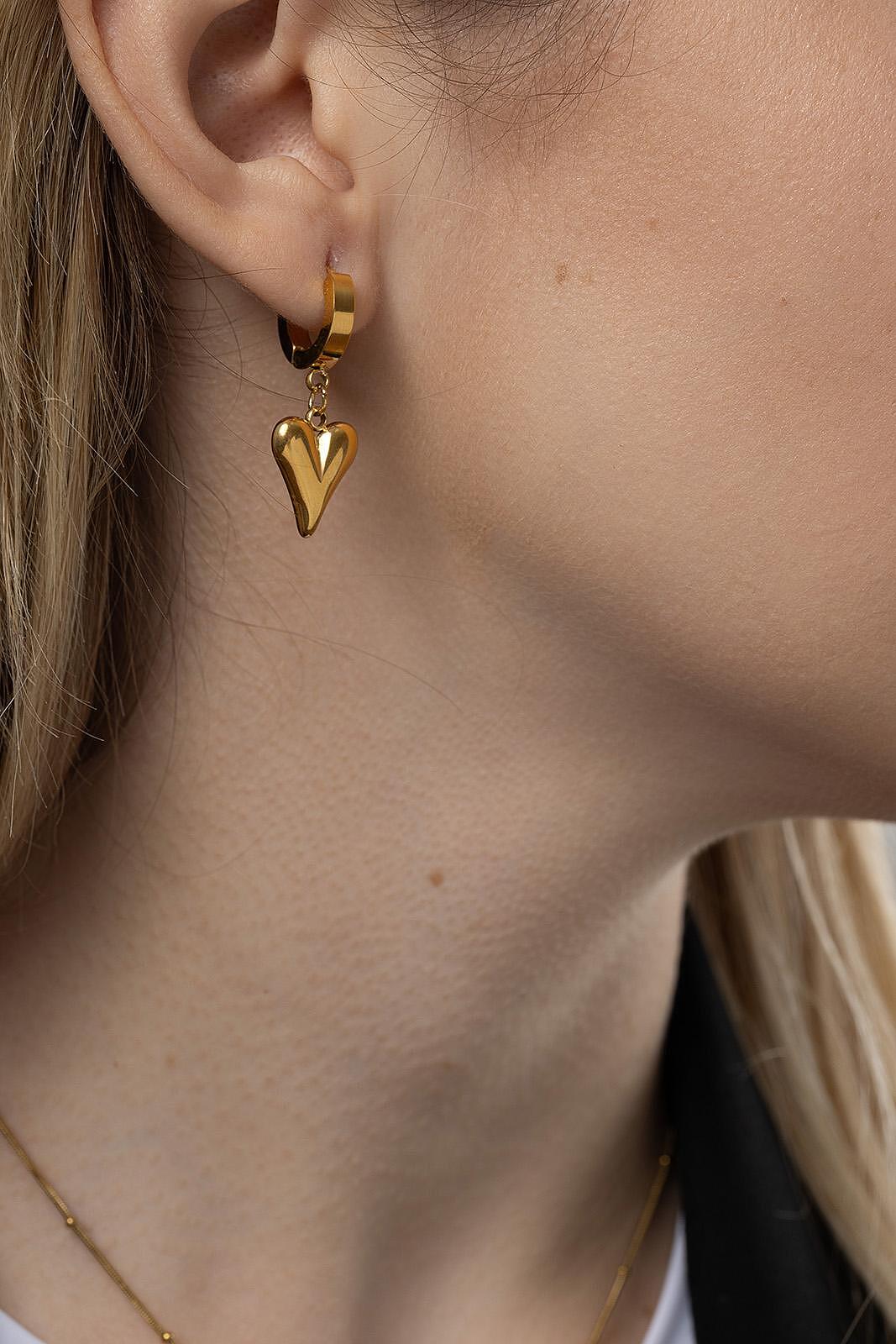 Висящи обеци от медицинска стомана във форма на сърце, златисти, идеални за романтичен стил и ежедневно носене.