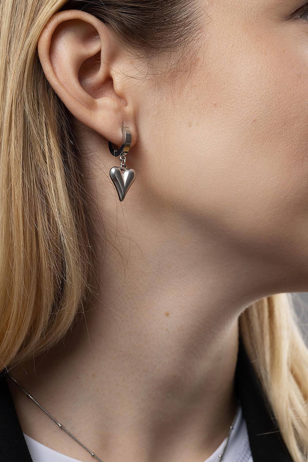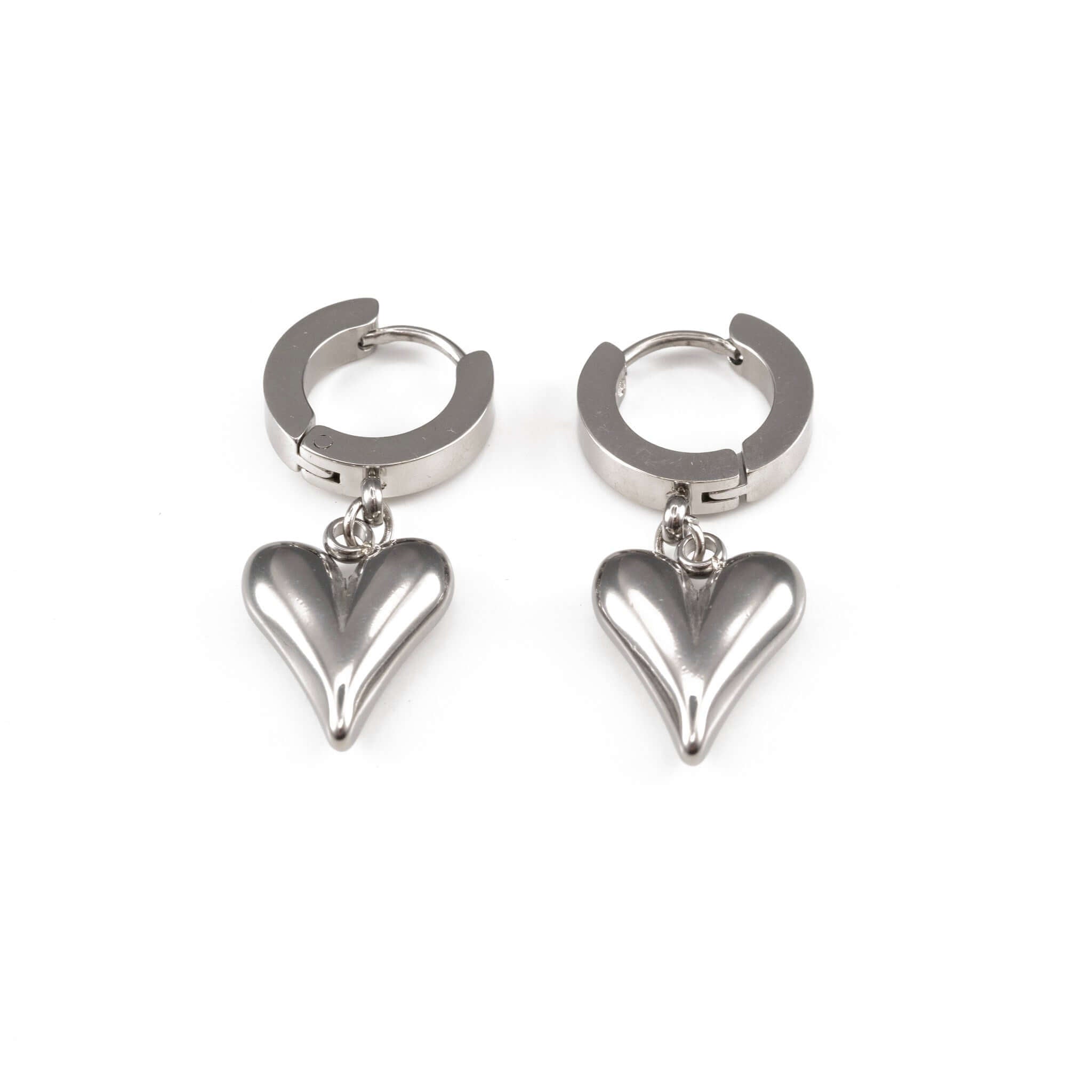 Висящи обеци с форма на сърце от медицинска стомана в сребрист цвят, подходящи за всекидневно носене.
